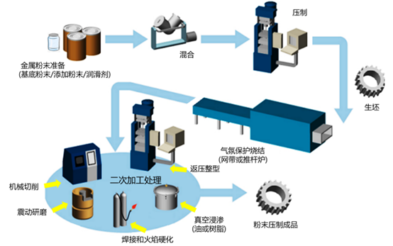 圖1.不同的粉末成形技術使用不同粒徑分布的金屬材料粉末注意到PM和MIM工藝用的粉末顆粒都和MAM工藝用的有交互重迭,其中MAM說的DED(定向能量沉積)其實就是已經(jīng)習用的粉末熱噴涂,這種工藝在煉鋼廠早就用來修復軋鋼的滾軋柱,經(jīng)過調整修改設備成為3D打印用的技術;粗粉的使用可以理解,同樣在細粉使用在增材制造也可以,但是固化3D建模的能量功率要降低,因此采用更低功率的激光和光斑(目前可以使用d50在3-5um的超細粉末,每層打印可以控制在0.01mm),或改用低溫的噴射粘結劑,成形後再使用無差別高溫燒結固化得到最終零件。l生坯中至少的80%(同樣材質以重量比即可,不同材質的混合粉末必須換算成體積比)粉末粒徑小于30μm以下,同時生坯中的固體粉末堆積率>45vol%(體積分率),才能夠精準的以阿基米得原理來推算最終產(chǎn)品的尺寸;l因此PM和MAM的部分技術是沒有辦法推算其生坯與燒結坯的尺寸比例關系;l各種技術發(fā)展所使用的粉末粒徑有一定的區(qū)隔,無法混合使用;l大于50μm以上的金屬粉末所具有的燒結驅動力(Drive force of sintering)大幅降低,無法有效的大范圍燒結并且融合再一起,這導致尺寸控制的方式不容易推算其數(shù)學模型,干擾因素太多;lPM的壓制后尺寸和燒結后的尺寸誤差僅為千分之2(0.2%收縮率),主要是根據(jù)經(jīng)驗累積;MAM使用熔融法則是精準地控制激光光斑和熔池,尺寸的誤差約在0.5%;MIM與MAM燒結法采用MIM粉末制作成喂料,粉末的粒徑(>80%)小于30μm,才能在準確的預測燒結后的產(chǎn)品尺寸。2.請簡單描述PM/MIM/MAM的工藝流程圖,并比較之。答:2.1 PM (Press and Sinter)粉末壓制與燒結法的流程圖如圖2所表示,主力設備是僅能進行上下閉合運動的壓機。這是一個近乎標準程序的流程,已經(jīng)有超過百年的歷史,進步模具的設計和模架機構使PM制品越來越精密且復雜。