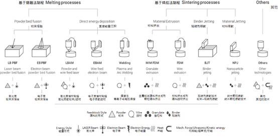 2.3MAM以金屬粉末做為增材制造成形的方式目前有許多的方式,如圖4所表示。大致分成三大類,即將金屬粉末直接熔融法制程(Melting process)和燒結法制程(Sintering process),這些技術沒有統(tǒng)一的標準,不過隨著技術的演變,也逐漸將材料、設備與方法清楚分類,并朝著更小的堆積層分辨率邁進,使用較小范圍的激光光斑、低溫成形(噴膠打印)、高溫同步固化,逐漸擴大產(chǎn)品量產(chǎn)的應用范圍以及產(chǎn)出效率的提升,或是朝更高分辨率前進。