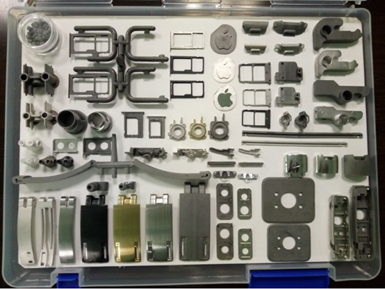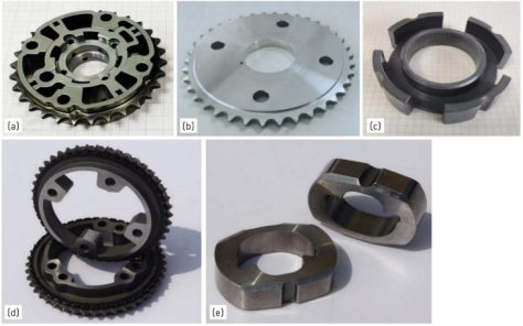 5. 每件產(chǎn)品的重量都超過100g以上的不同PM制品展示,:(a)VVT(可變氣門正時)轉子/鏈輪;(b)鋁合金鏈輪;(c)軟磁定子;(d)橡膠包覆進/排氣凸輪軸定子鏈輪(本零件榮獲世界PM2018產(chǎn)品獎);(e)密度≥7.53 g/cm3的打擊塊(本零件榮獲世界PM2018產(chǎn)品獎),所有照片均由寧波東睦集團NBTM提供。4.2 MIM製品MIM制品如圖6所表示,都是一些形狀復雜的零件且產(chǎn)品重量沒有超過50g,大部分都低于10g甚至有0.5g的小產(chǎn)品。 圖6.