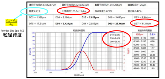 圖9.粉末激光粒度分析儀檢驗后所獲的圖表lDXX(亦有小寫dxx)指的是平均粒徑的累積數(shù)值,其中XX是由0~100之間的數(shù)字,表示本批測量粉末顆粒數(shù)總量數(shù)字,當粉末體是均質物質可以是重量比也可以理解為顆粒個數(shù)比,使用的是以含量%表示(藍色曲線)。lD10通常是累積到10%,D50到50%,以此類推。自然狀態(tài)下粉末的顆??倲?shù)會行成高斯分布狀態(tài)(紅色曲線),易即趨于中間值最多。l因此有四個重要的數(shù)值必須觀察:nD10 -這是可以作為最小粉末平均粒徑的依據(jù),通常小于D10以下的粉末顆粒都很細微,不過D10不能太小,過多細小的顆粒會導致制程中設備的高度摩擦,并使喂料容易摩擦熱裂解;nD50-粉末平均粒徑中值是整批粉末的代表數(shù)值,這是整批粉末中顆粒最多的范圍聚集后平均數(shù),購買粉末與數(shù)學運算的基礎數(shù)據(jù);nD90-這是較大粉末平均粒徑的代表,由此開始必須控制D90-D100粉末數(shù)量的百分比nD97-這是最大粉末粒徑的限制條件,也有部分儀器是表示D99或D100,大顆粒粉末數(shù)量過多會造成產(chǎn)品質量的干擾,隨后將說明。l比表面積可以代表受測粉末的整體性質,此數(shù)字月大代表粉末D50越朝細小前進,小的粉末有比較大的數(shù)量並造成比表面積增大,因此會導致成形過程的阻力(模具、工具與治具的磨損,送料困難)l跨度,粉末跨度越大,會導致產(chǎn)品的孔隙度的增加與表面缺陷,主要在於大顆粒與小顆粒在燒結驅動力的差異,較小粉末團聚很快緻密,但位於較小粉末堆中的大顆粒難以燒結收縮,缺陷便產(chǎn)生如圖10所表示。